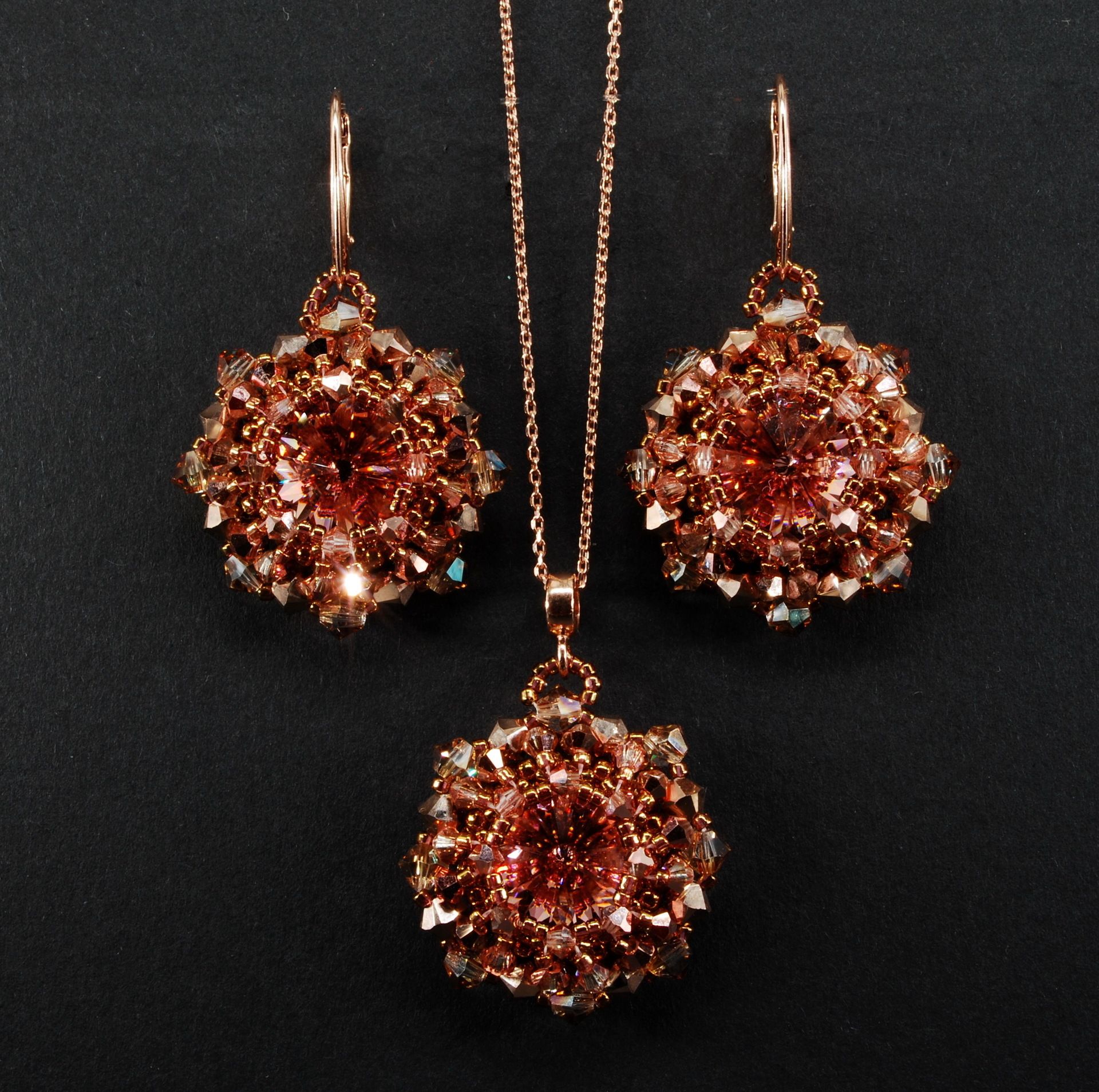 Set šprkov bol vyrobené obšitím rivoli kabošonu 14 mm. Pri obšívaní boli použité korálky najvyššej japonskej kvality Toho round 11,15,8. Dozdobený je Biconkami rakúskeho a českého výrobcu.