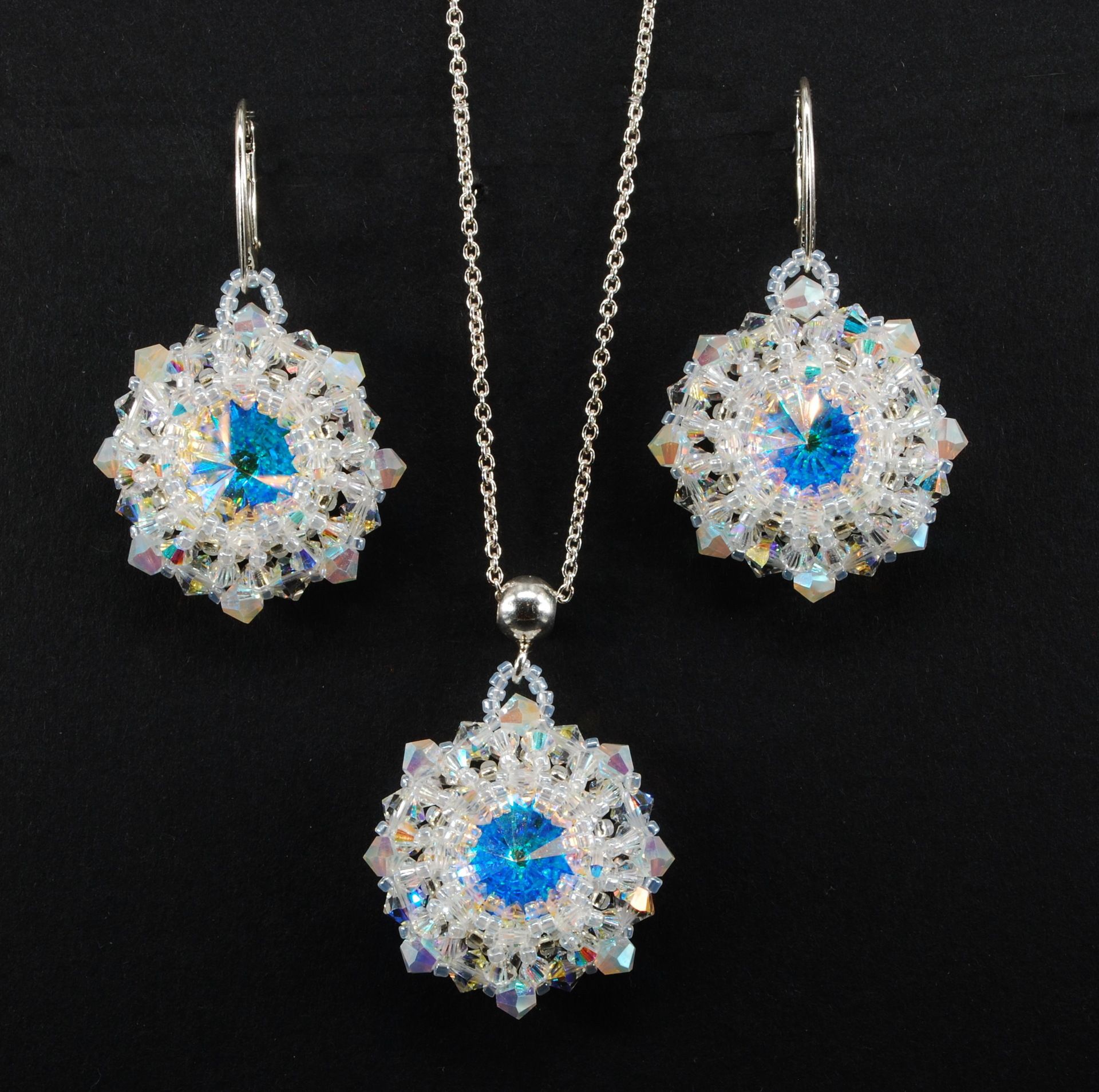 Set šprkov bol vyrobené obšitím rivoli kabošonu 14 mm. Pri obšívaní boli použité korálky najvyššej japonskej kvality Toho round 11,15,8. Dozdobený je Biconkami rakúskeho a českého výrobcu.